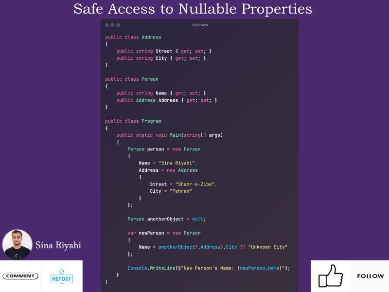 | Safe Access to Nullable Properties | | https://medium.com/@Sina-Riyahi/safe-access-to-nullable-properties-5e5ca3b6d113 🔎 Explanation of Safe Access Operator 💡 In the context of object initializers, the safe access operator (?.) can be used to simplify the… | |  | | |