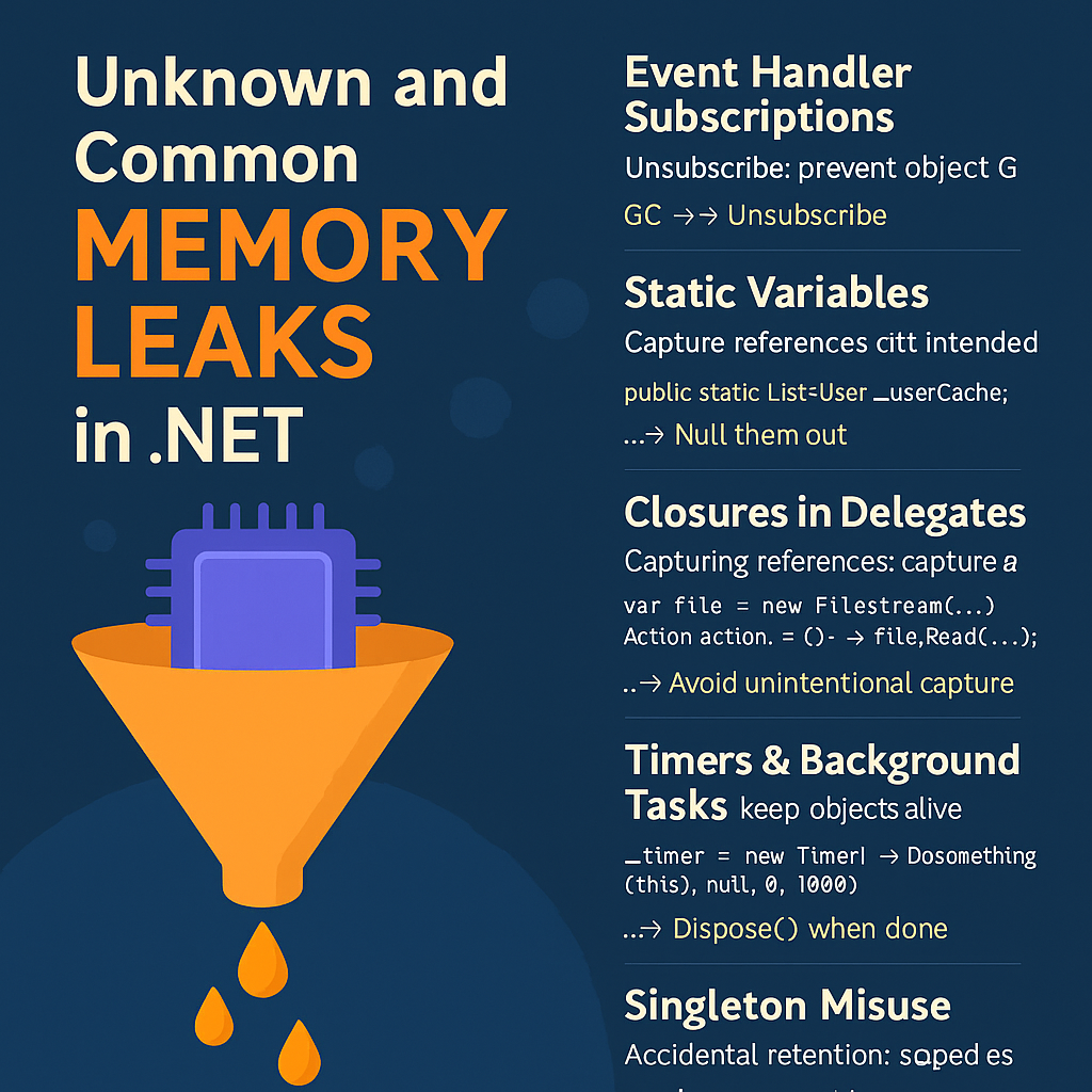 | Unknown and Common Memory Leaks in .NET — And How to Fix Them Before They Haunt You | | https://dotnetfullstackdev.medium.com/unknown-and-common-memory-leaks-in-net-and-how-to-fix-them-before-they-haunt-you-f54e5beef344 Memory leaks in .NET might sound unlikely — after all, isn’t garbage collection supposed to take care of everything? | |  | | |